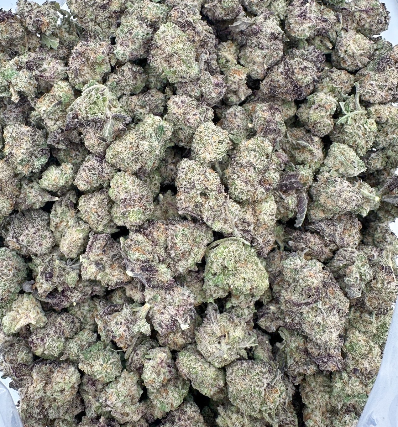 Its aroma is sweet and fruity, dominated by grape and berry notes with hints of citrus, vanilla, and subtle gas. The flavor delivers a smooth inhale of sweet purple fruit and creamy citrus, followed by a slightly earthy, gassy finish. The buds are dense and visually striking, featuring deep purple hues, dark green accents, bright orange pistils, and a thick coating of frosty trichomes.